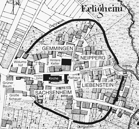 Damit war das Dorf in vier Teile aufgeteilt: Mainzisch, Gemmingisch, Neypperisch und Sachsenheimisch. Einzelne Teile wurden jedoch in kaum überschaubarer Weise verkauft, versetzt, verpfändet und aufgesplittet. Offensichtlich ist es den Bauern in Erligheim und Bönnigheim jedoch gelungen, wohl durch die komplizierten Herrschaftsverhältnisse, frei von der Leibeigenschaft zu bleiben.